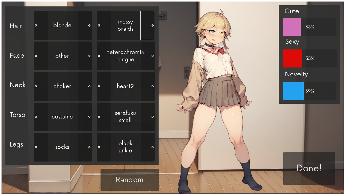 Same for selecting the girl's outfit, teh UI is very annoying to use, since you have to go through all the elements one by one, instead of having a list telling you all that you can select from the get go.